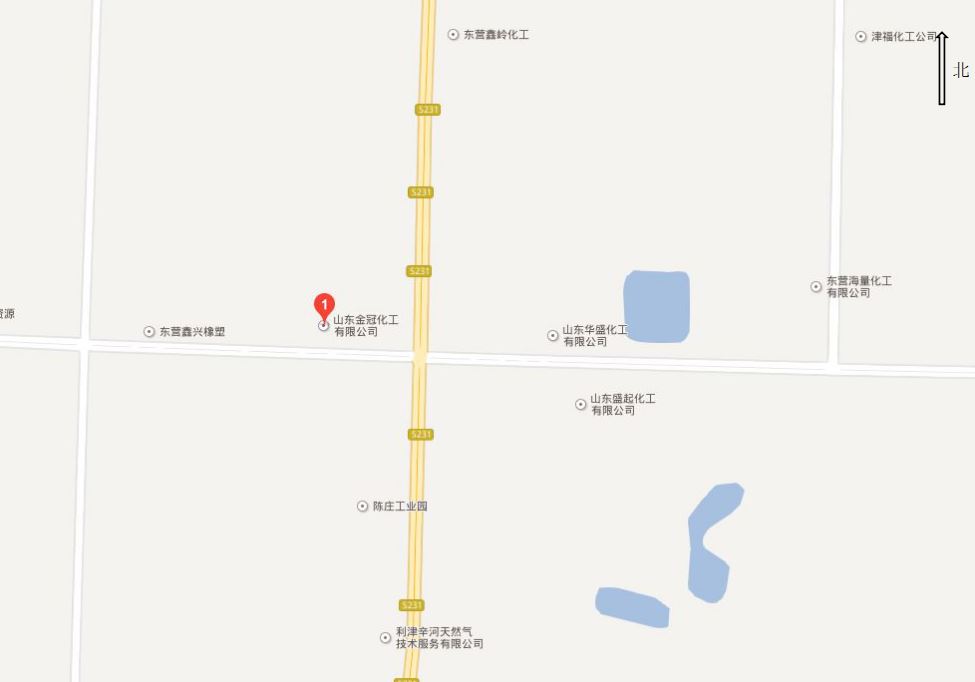 山東金冠化工有限公司位于東營市利津縣陳莊工業園。路東為S231,S231東側為華盛化工有限公司;廠區南側為北一路;西側為鑫興橡膠有限公司;東北側120米處,布置有機械采油井;北側為空地,空地以北為黃河口酒業有限公司。 |