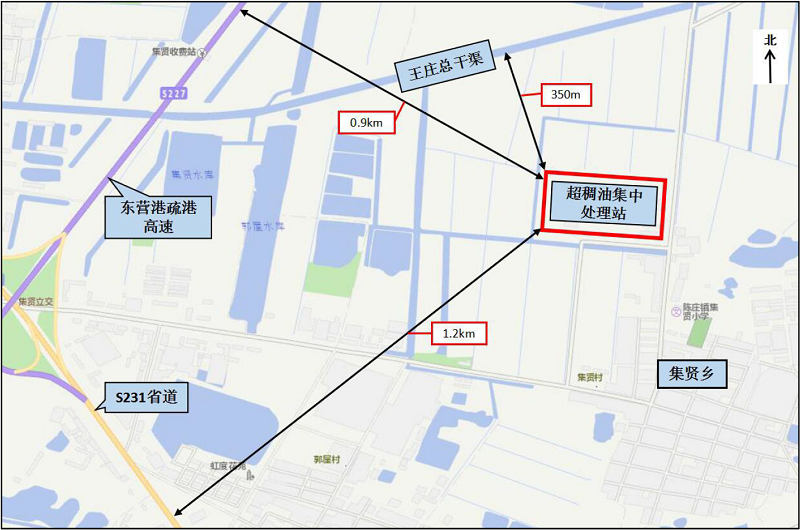 超稠油集中處理站位于東營(yíng)市利津縣集賢鄉(xiāng)西北側(cè),王莊總干渠南350m處,東南側(cè)為集賢村居民房屋,區(qū)域外圍有東營(yíng)港疏港高速、S231省道等,分別距離約0.9km、1.2km。西側(cè)和北側(cè)均為農(nóng)田。新建污水沉降罐距離東側(cè)消防水罐35m,距離東南側(cè)消防泵房33m,距離東南側(cè)辦公樓44m,距離南側(cè)值班室和化驗(yàn)室42m,距離西南側(cè)加熱爐66m,距離西南側(cè)鍋爐操作間43m,距離西側(cè)消防器材間19.5m,距離西側(cè)聯(lián)合泵房33.5m,距離北側(cè)油罐區(qū)38m。 |