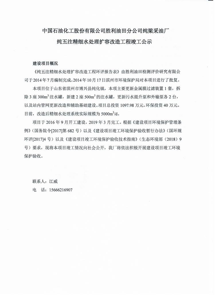 中國石油化工股份有限公司勝利油田分公司純梁采油廠純五注精細水處理擴容改造工程竣工公示