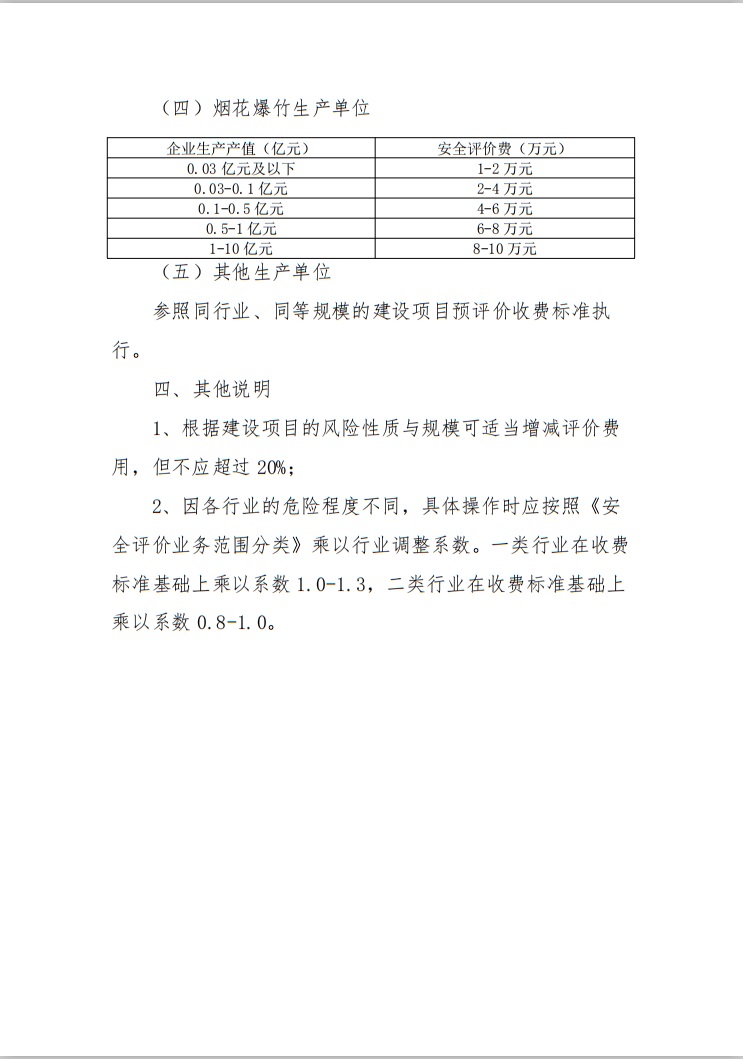 2、因各行業的危險程度不同,具體操作時應按照《安全評價業務范圍分類》乘以行業調整系數。一類行業在收費標準基礎上乘以系數1.0-1.3,二類行業在收費標準基礎上乘以系數0.8-1.0。